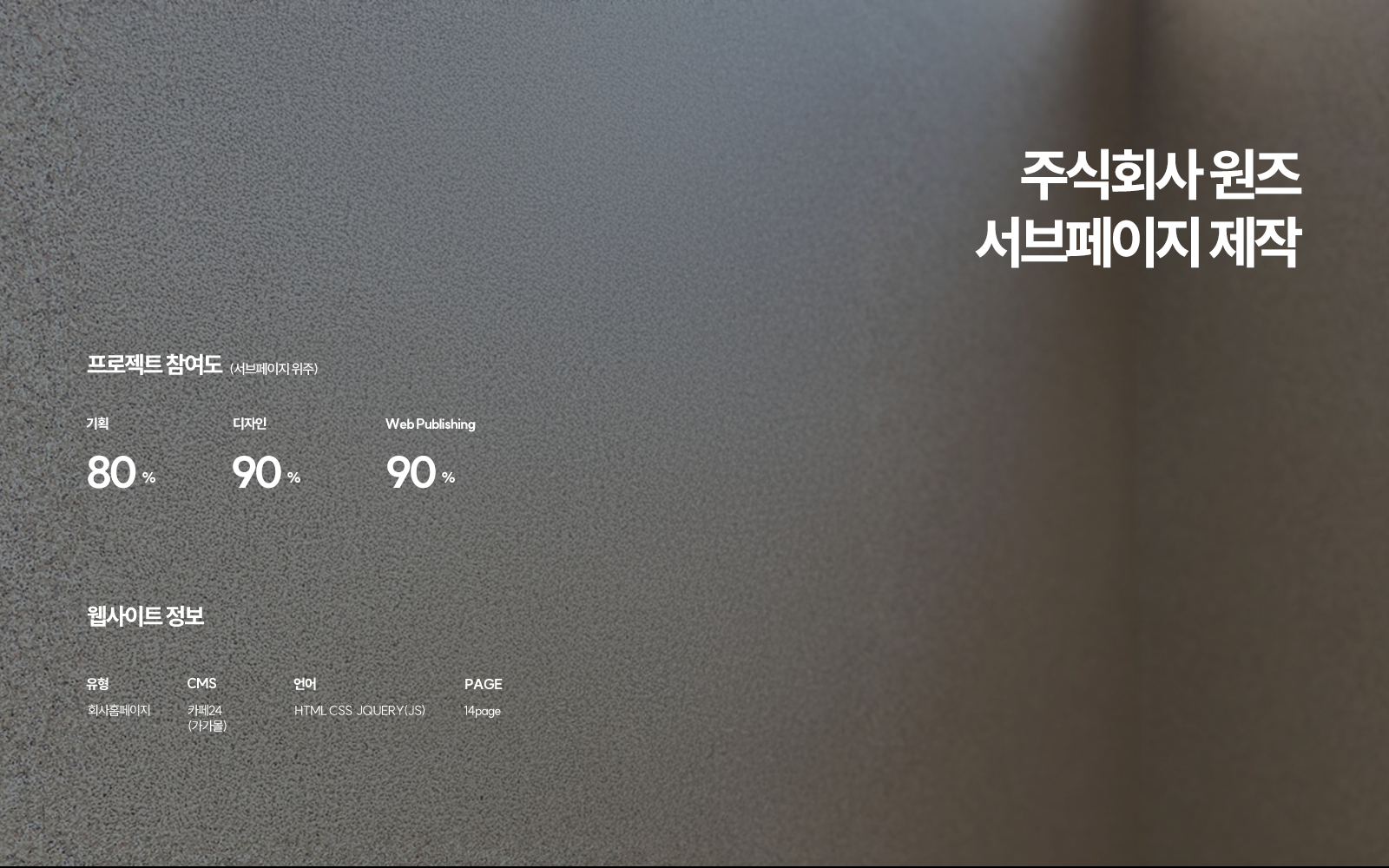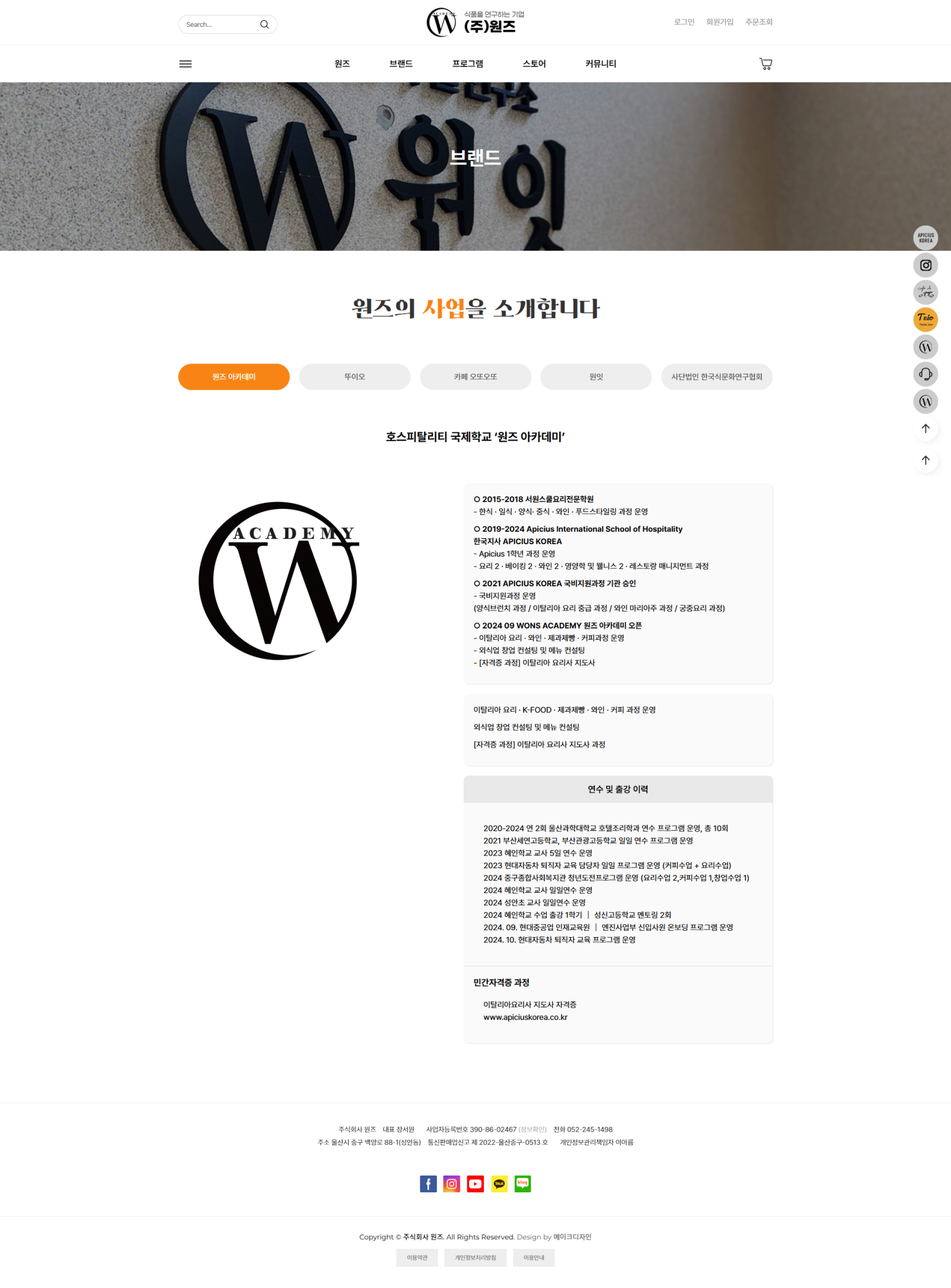 2023~2024 원즈 서브 페이지 진행 페이지 정보 빈거 바로가기 ☰목록 본문 원즈 서브 페이지 시안 및 페이지 퍼블리싱 진행 http://wons2022.com/mall/index.php 55회 연결 이전글조광페인트 카테고리 추가 25.07.30 다음글프라임요리제과제빵커피학원 서브 25.07.30